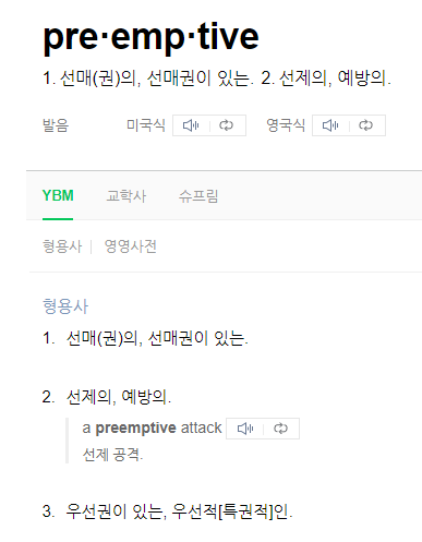 그런데 재미난 단어는 preemptive 이다. 네이버 사전을 먼저 보자.