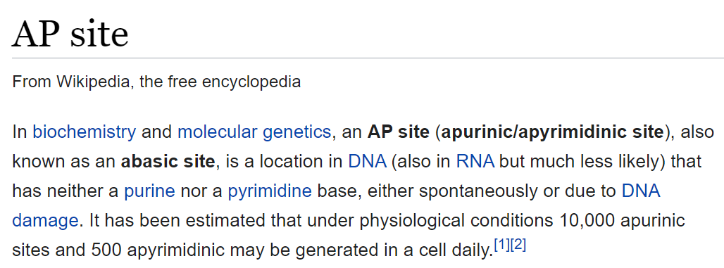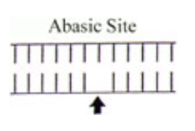 Base가 없는 곳을 의미한다. 아래 그림에서와 같이 sugar-phosphase backbone의 경우에는 여전히 손상되지 않은 상태이지만, Base는 온전치 못한 상태이다. 일단 이것이 발생하는 원인은 온도가 증가하거나, pH가 떨어지거나, Base에 있는 alkylation이다. 이것은 N-glycosidic 결합을 불안정하게 만든다.