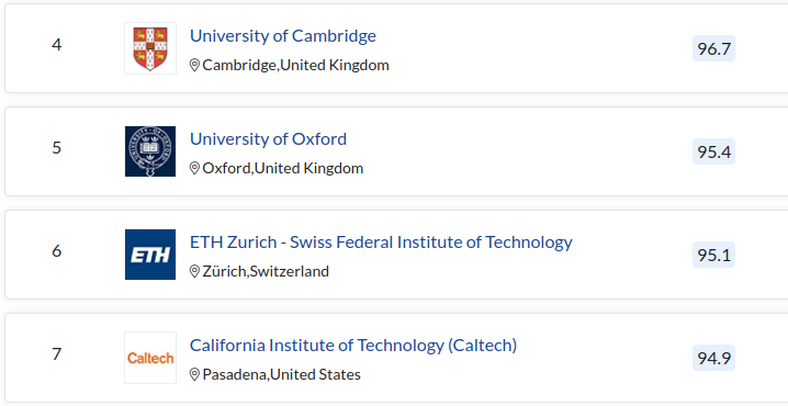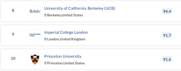 자연과학 QS 세계대학순위 10위권 내만 보면 아래와 같다.