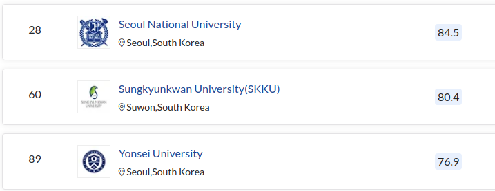[2025년 QS 국내대학순위] 종합 대학교 순위 (0) 2024.12.02 [2025년 QS 세계대학순위] 종합 대학교 순위 (1) 2024.12.02 [2021년 QS세계대학순위] 자연과학 대학순위! (1) 2021.03.05 [2021년 QS 세계대학순위] 사회과학 대학순위! (1) 2021.03.05 [타임즈 세계대학순위 :: 2021년] 의대 및 치대 관련 학과들 (0) 2021.02.09