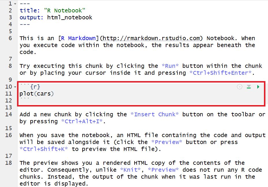 먼저, 이것은 Chunk(청크) 라는 것으로 구분되는데 그냥 쉽게 말해서 앞에서 설명한 일부 코드를 의미한다. 아래에 보면, 빨간색 부분이 이러한 청크에 해당하고, ```{r} 과 ``` 사이에 원하는 코드를 작성하면 된다. 아래의 경우 예제로 plot(cars)가 들어가 있다.