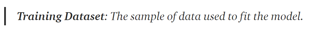 훈련 데이터셋은 아래에 보이듯이 모델을 적합하기 위해서 사용되는 데이터 샘플을 의미한다. 여기서 중요한 표현은 적합할 때 사용된다는 부분이다. 왜냐하면 다른 데이터셋들도 우리가 가진 데이터 샘플이긴 마찬가지지만, 용도가 다르기 때문이다.