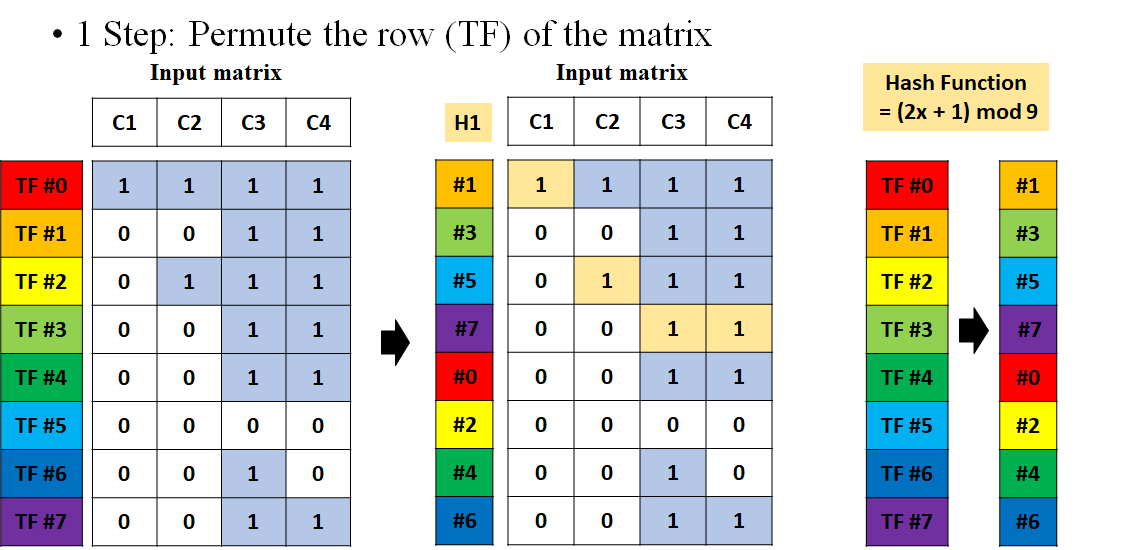 첫 번째 단계에서는 행의 인덱스를 섞는 과정이 필요하다. 여기서 Hash 함수라고 해서 이렇게 랜덤으로 순서를 섞는 것을 의미한다. 또는 해쉬함수는 이후에 Signature 행렬을 계산하게 되는데, 이것을 만들어 내는 전체 과정을 해쉬 함수라고 부르기도 한다. 그런데 여기서는 랜덤 섞음을 하는 것에 한정해서 이야기 하겠다.
