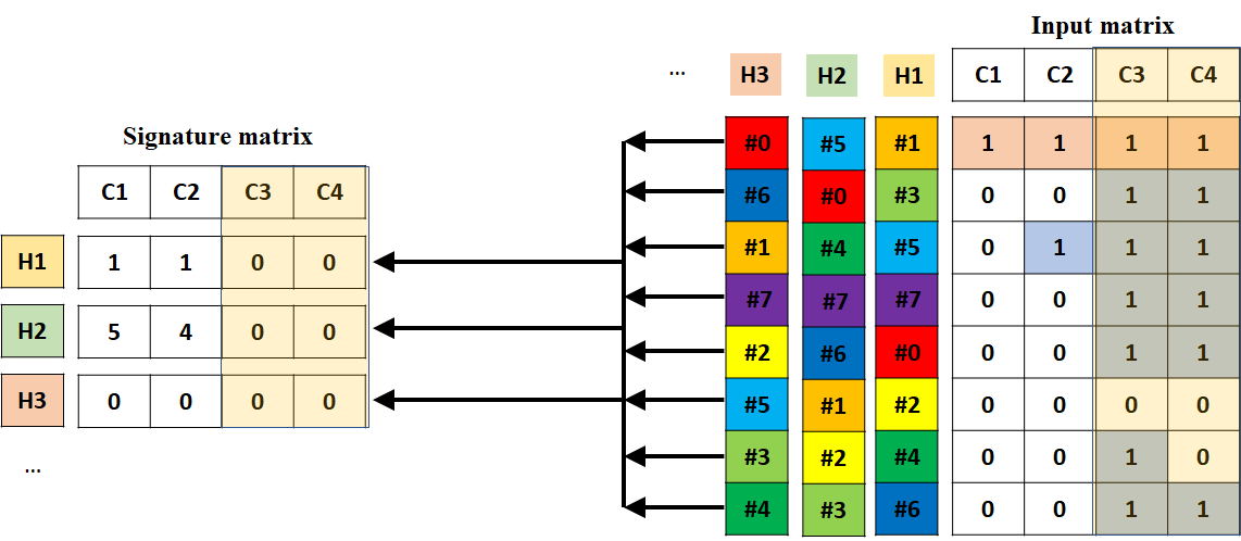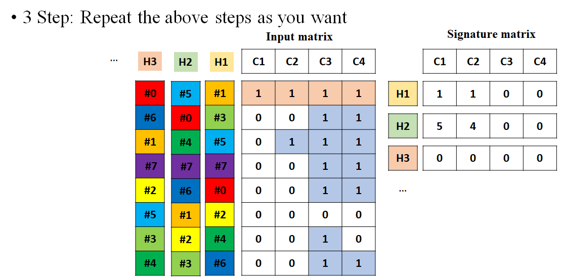 3 단계: 위의 과정을 반복해서 원하는 개수의 해쉬 함수만큼 Signature 행렬을 확장시킨다.