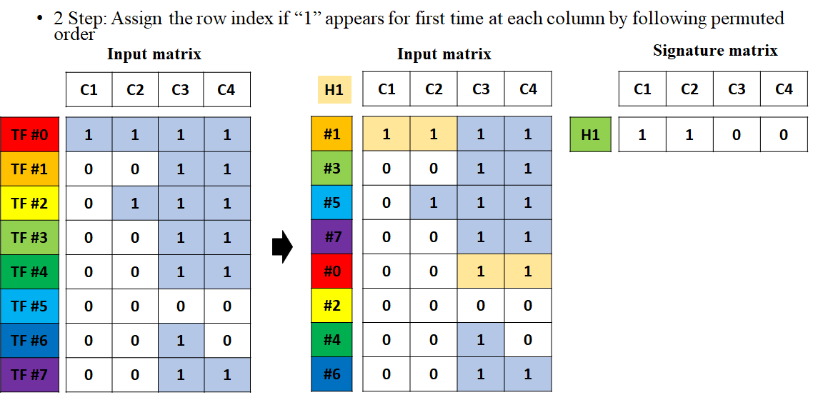 2 단계: 바뀐 인덱스를 순서대로 따라 가면서 1이 처음 등장하는 열을 체크 하고 이 때의 인덱스를 Signature 행렬의 값으로 할당한다.