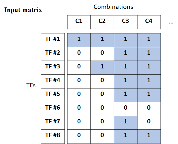 위의 인풋에서 행과 열은 본인의 데이터의 형태에 따라 어떠한 것도 될 수 있다. 여기서는 생물 데이터의 TF정보와 그에 따른 Combination을 행과 열로 설정하였다.