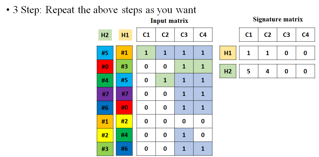 3 단계: 위의 과정을 반복해서 원하는 개수의 해쉬 함수만큼 Signature 행렬을 확장시킨다.