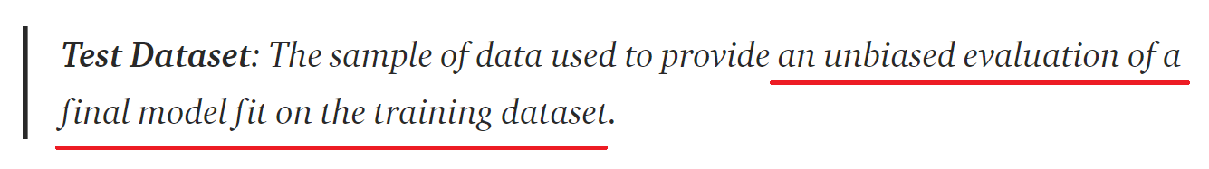 Test 데이터셋은 모델을 평가하는 표준을 제공한다. 이 데이터셋은 완전하게 모델이 훈련되었을 때, 딱 한번만 사용된다. 완전하게 훈련되었다는 것은 훈련 데이터셋과 검증 데이터셋을 둘 다 사용하여 최종적으로 학습된 모델을 의미한다. 시험 데이터셋은 일반적으로 경쟁하는 모델들을 평가하기 위해서 사용된다.