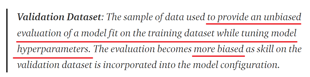 검증 데이터셋에서 중요한 표현은 모델의 하이퍼파라미터를 미세조정(Fine-Tuning) 할 때, 훈련 데이터셋에 적한된 모델의 바이어스가 없는 평가 지표를 제공하는 데이터 샘플이라는 것이다. 그리고 추가로 검증 데이터셋이 모델을 만들어갈 때 사용되게 되면 그만큼 바이어스가 더욱 발생하게 된다는 것도 기억하자.