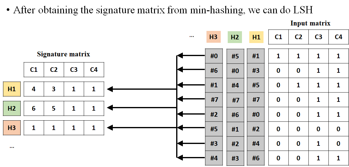 그런데 왜 Min-hashing을 설명한 이후에 LSH를 설명했는가 하면, 사실 LSH는 보통 Min-hashing이 끝난 후, 만들어진 Signature 행렬에 적용하는 경우가 대부분이다.