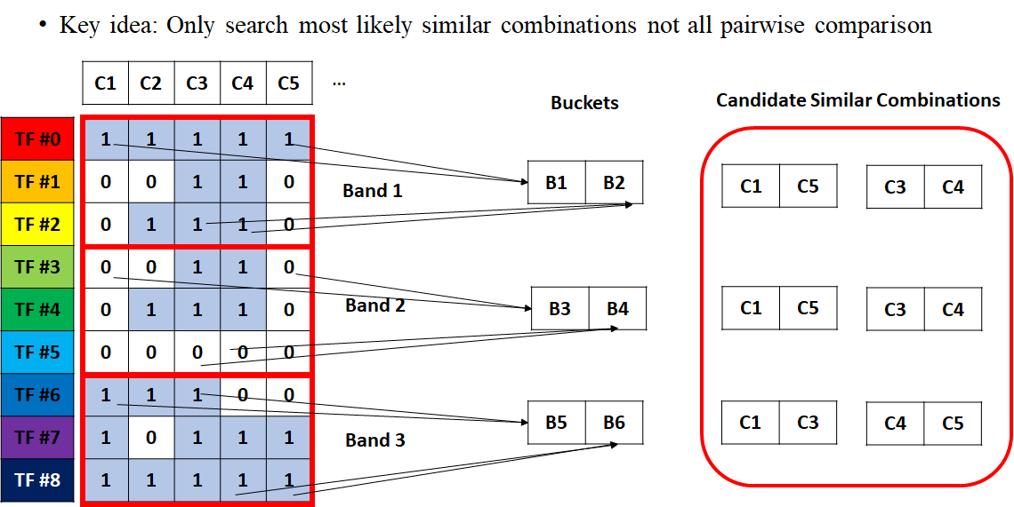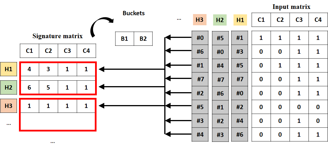 여하튼 이렇게 지정된 Band 들을 보자. 각 밴드 내부에서 클러스터링을 실시한다. 그래서 한번이라도 같은 클러스터링에 할당되면 여기서는 이것을 bucket 이라고 부르는 클러스터에 할당되었다고 표현한다. 이렇게 bucket에 한번이라도 두 개 또는 그 이상의 열이 할당되면 이것은 후보 유사 문서 집합에 할당된다. 여기서 문서라고 문제를 설명했지만, 이것은 사실 어떠한 차원의 데이터도 될 수 있다.